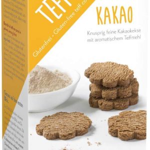 IngredientesIngredientes: Farinha integral de teff (25%), açúcar, óleos vegetais não hidrogenados (óleo de palma), farinha de banana, amido de tapioca, cacau em pó (2%), aroma natural, levedantes (bicarbonato de sódio), sal.
